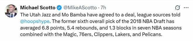 雷速体育9月26日讯 据美记Michael Scotto透露,犹他爵士已经与自由球员班巴达成协议。班巴是2018年的6号秀,当时他被魔术选中。班巴的静态天赋惊人,臂展达到了2米39,一度被看好成为顶级护筐者。不过班巴的职业生涯发展并不顺利,先后辗转多支球队都没能兑现天赋。7个赛季下来,班巴的场均数据是6.8分5.4篮板和1.3次盖帽。此前,据国内媒体人“半神半卡特”曾爆料,有CBA球队为班巴开出了税前300万美元的报价合同,一度引起热议。
