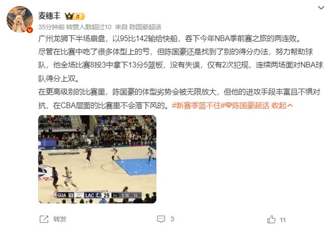 广东媒体人麦穗丰也评价了陈国豪的第二场季前赛:尽管比赛中体型上很吃亏,但陈国豪总是能想到得分的办法,努力帮助球队,连续两场面对NBA球队上双。在更高级别的比赛中陈国豪的体型、尺寸劣势会被无限放大,但陈国豪进攻手段丰富且无惧对抗,在回到CBA后不会落下风。(26岁的陈国豪在今夏转投广州后,新赛季数据必然大幅提升,他很有希望再次入选中国男篮集训队)相关资讯