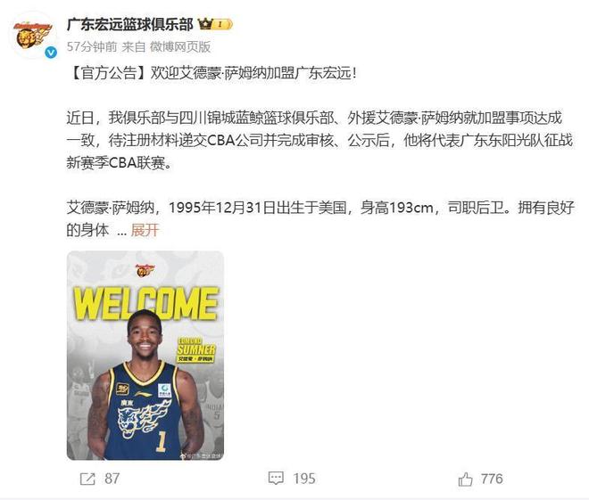 今年夏天休赛期多支球队有意萨姆纳,比如北京首钢队、北控男篮和新疆队等,但是只有广东队和朱芳雨坚持到了最后,最终和萨姆纳完成签约。这期间萨姆纳多次自宣加盟广东队,看来他也确实喜欢广东队这支球队,想要去广东队打球,所以今天这样应该是皆大欢喜的局面。广东队得到了后卫线上的补强,四川队拿到了一笔不菲的优先续约权转让费,萨姆纳去到了自己喜欢的球队,妥妥的多方共赢。