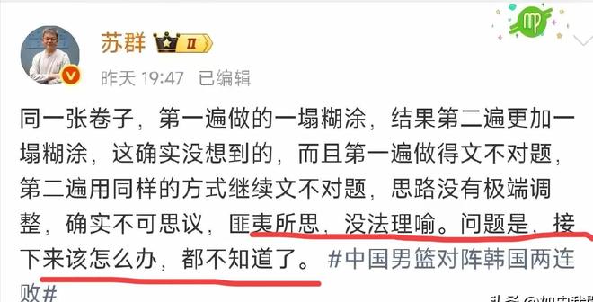 反观郭士强,不仅没有及时发现战术的漏洞,还在采访中“死不承认”。甚至断言中国男篮成功入选世界杯已经失去主动权,无疑是杀自己的威风。著名评论员苏群的评价显得犀利无比。